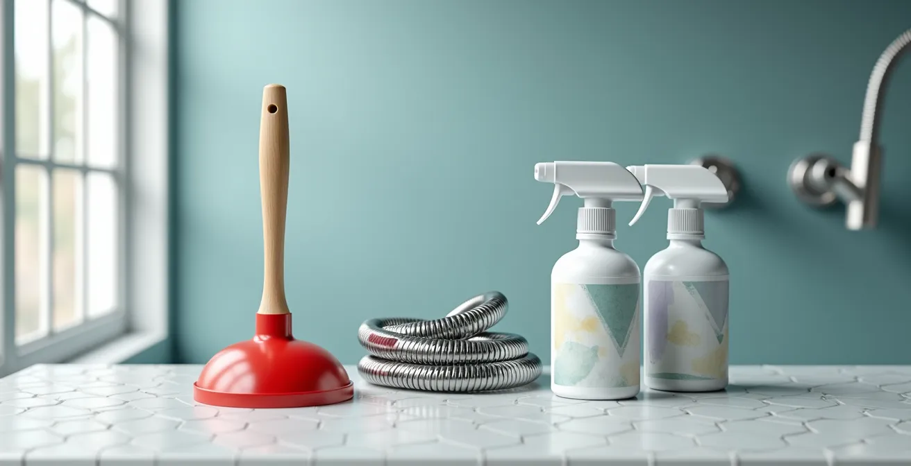 Avant d’envisager toute action mécanique, la CMMTQ propose une alternative de « premiers soins » sans danger pour vos tuyaux. Pour un bouchon léger, mélangez ¼ de tasse de bicarbonate de soude avec du sel, versez dans le drain, suivi d’une tasse d’eau bouillante. Laissez agir une minute puis rincez abondamment à l’eau froide. C’est un traitement préventif et curatif doux. Si cela ne suffit pas, il est temps de passer à un diagnostic mécanique, mais certainement pas à une solution chimique qui pourrait transformer un simple bouchon en une catastrophe de plomberie.